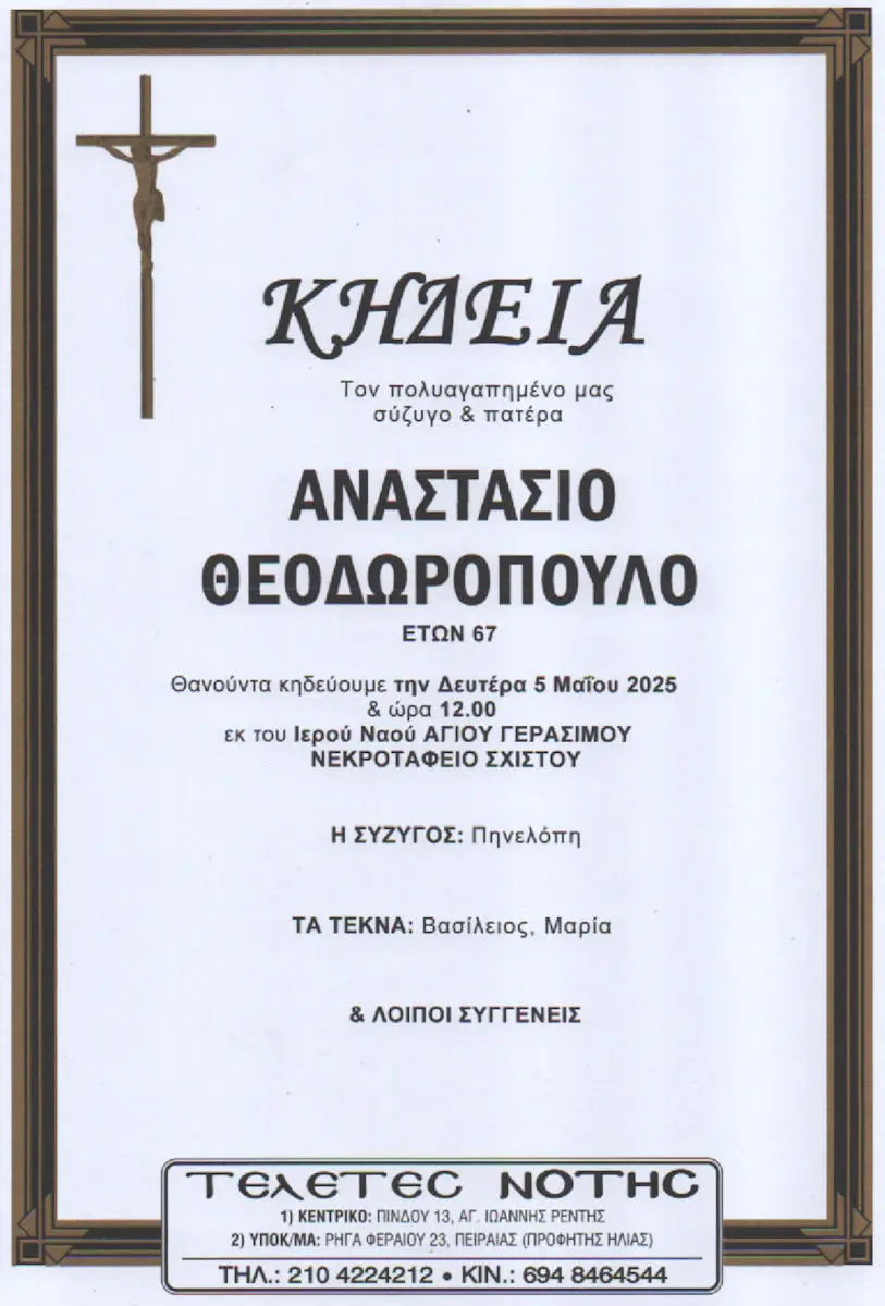 Για όσους Συμμαθητές επιθυμούν να παρευρεθούν, η επικήδειος τελετή θα πραγματοποιηθεί την Δευτέρα 5 Μαΐου 2025 και ώρα 12:00 στο Κοιμητήριο του Σχιστού.
