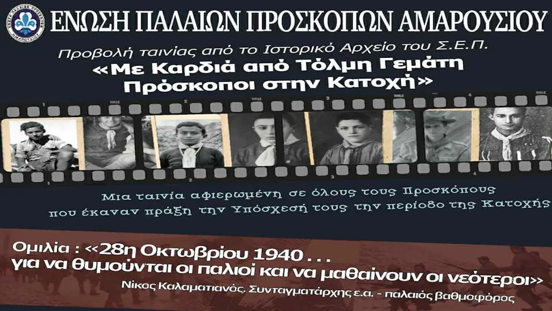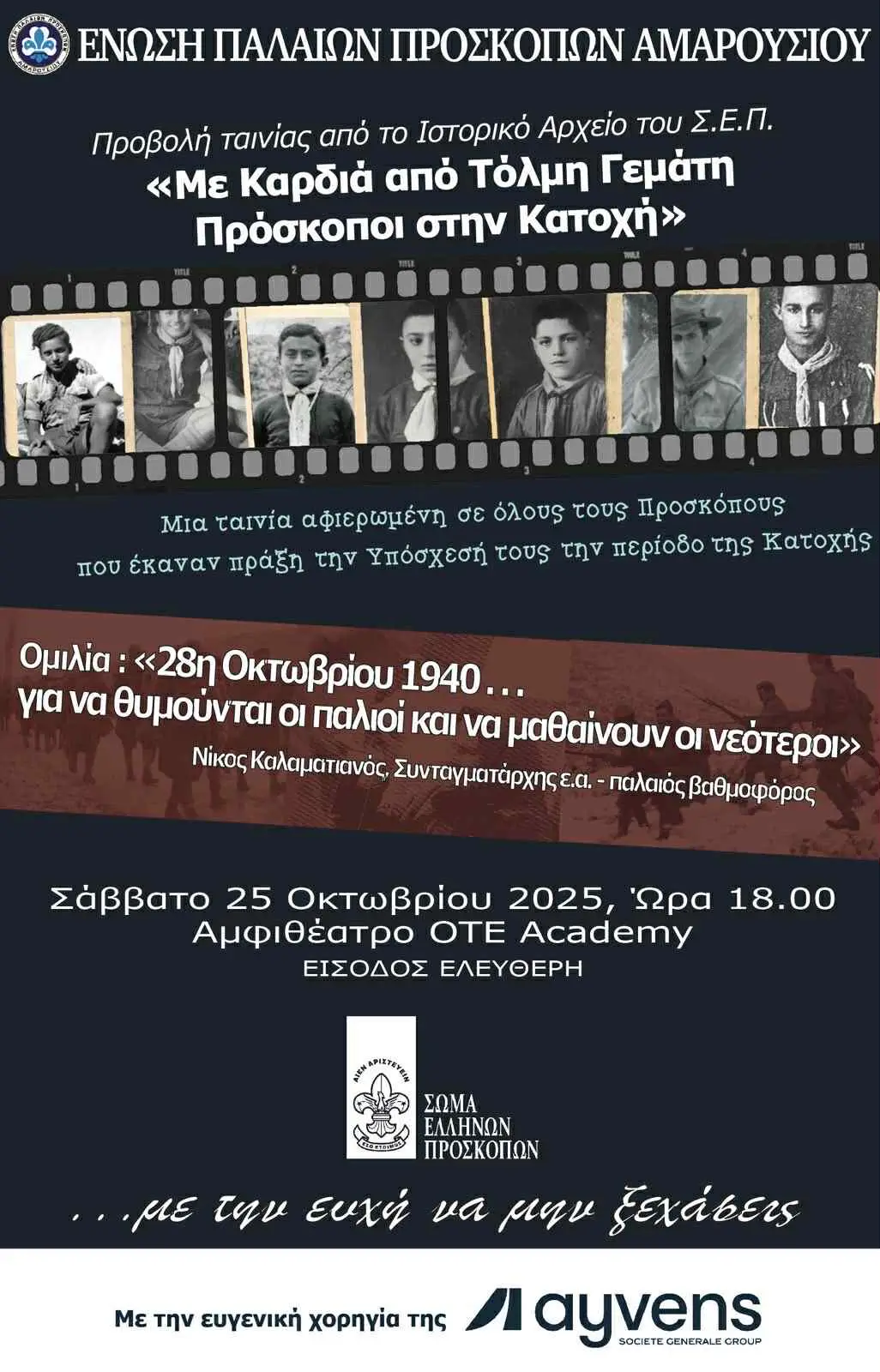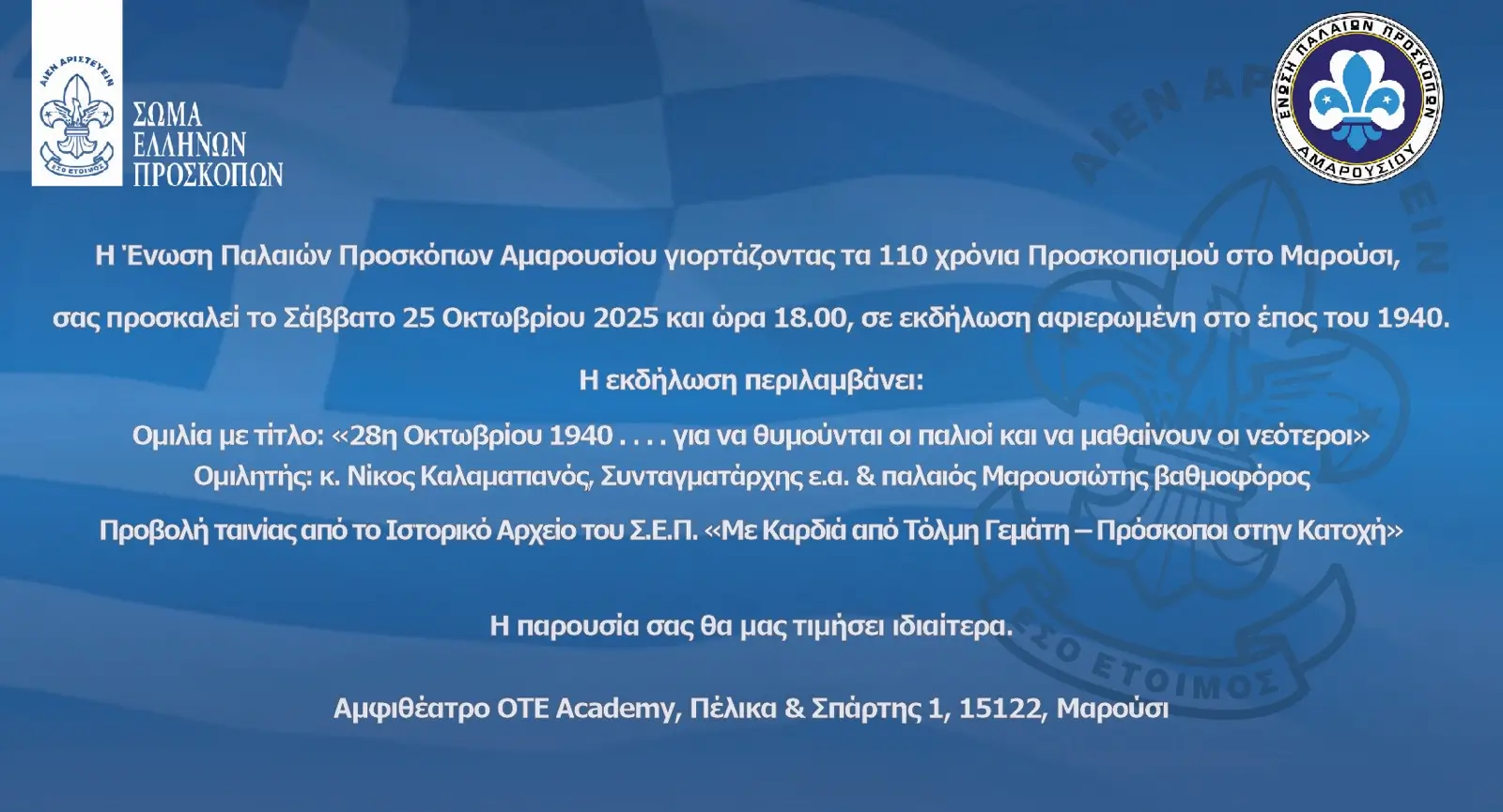 Το Σάββατο 25 Οκτωβρίου 2025, Ώρα 18.00, στο Αμφιθέατρο OTE Academy στο Μαρούσι, σε εκδήλωση που διοργανώνει η Ένωση Παλαιών Προσκόπων Αμαρουσίου, αφιερωμένη στο έπος του 1940, θα γίνει ομιλία με τίτλο: «28η Οκτωβρίου 1940…. για να θυμούνται οι παλιοί και να μαθαίνουν οι νεότεροι» και Ομιλητή τον Συμμαθητή μας Νίκο Καλαματιανό.