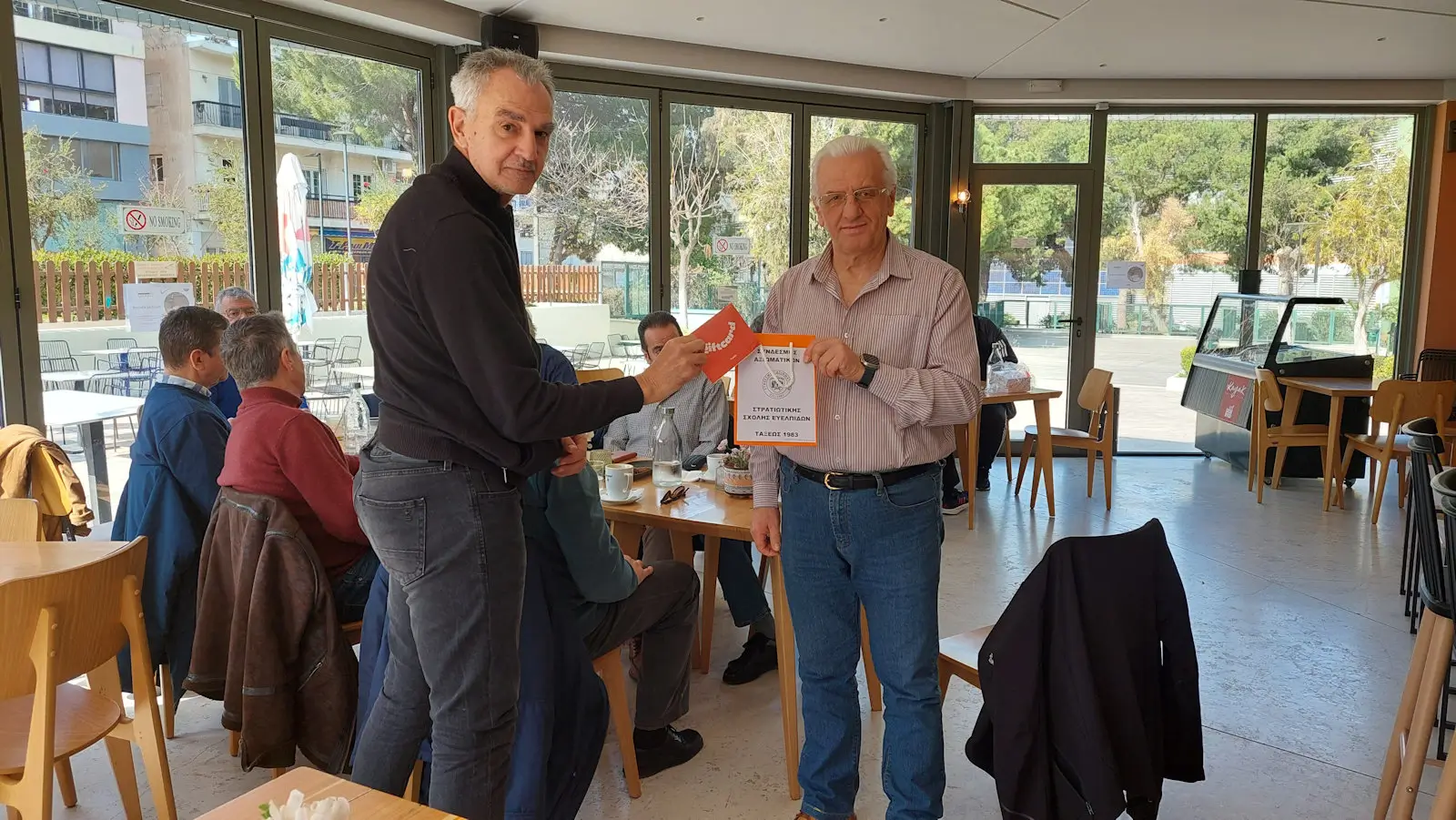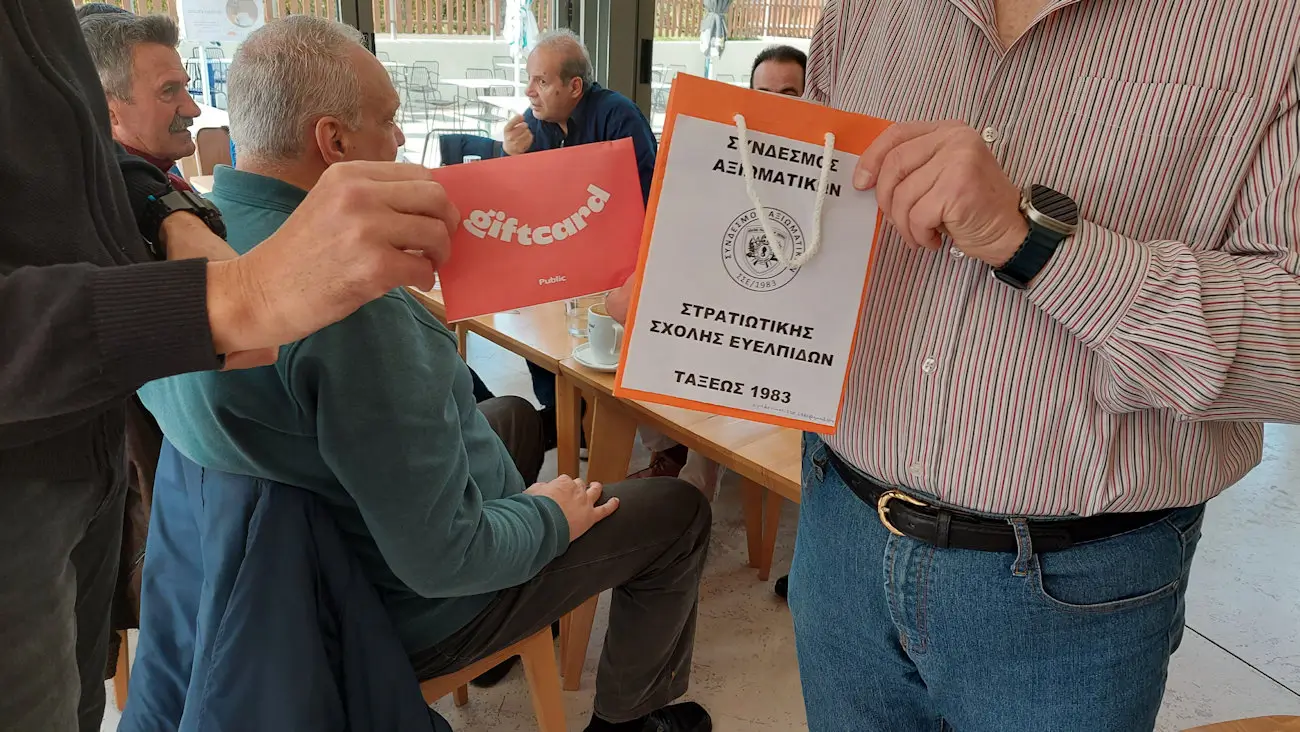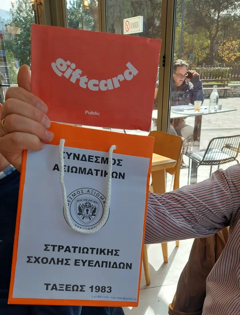 Ως εκ τούτου, η συνάντηση συμμαθητών ορίσθηκε στην υπόψη καφετέρια, προκειμένου να επιδοθεί η Δωροεπιταγή, όπως και έγινε και την παρέλαβε εκπρόσωπος του Κέντρου, ο οποίος είναι και συνάδελφος.